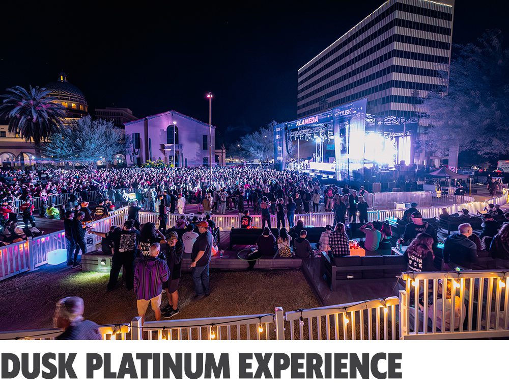 The DUSK Platinum Experience, presented by Iridius Capital, Singularity Capital and RIGHTSURE Insurance, is literally on another level offering all of the DUSK VIP Experience amenities plus an elevated lounge and bar area with comfortable seating and a stage-level viewing experience.