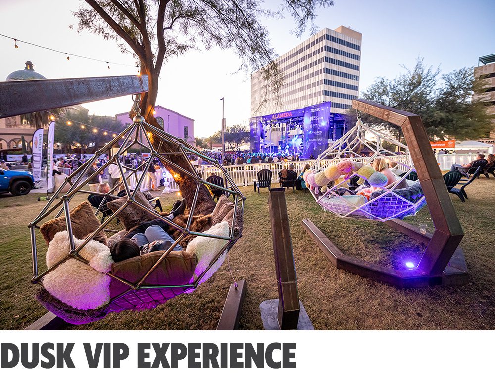 Treat yourself to the VIP Experience you deserve at DUSK. Starting with Express VIP Entry Lanes, you'll have access to our spacious VIP area located next to the Alameda Stage.